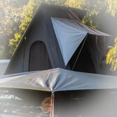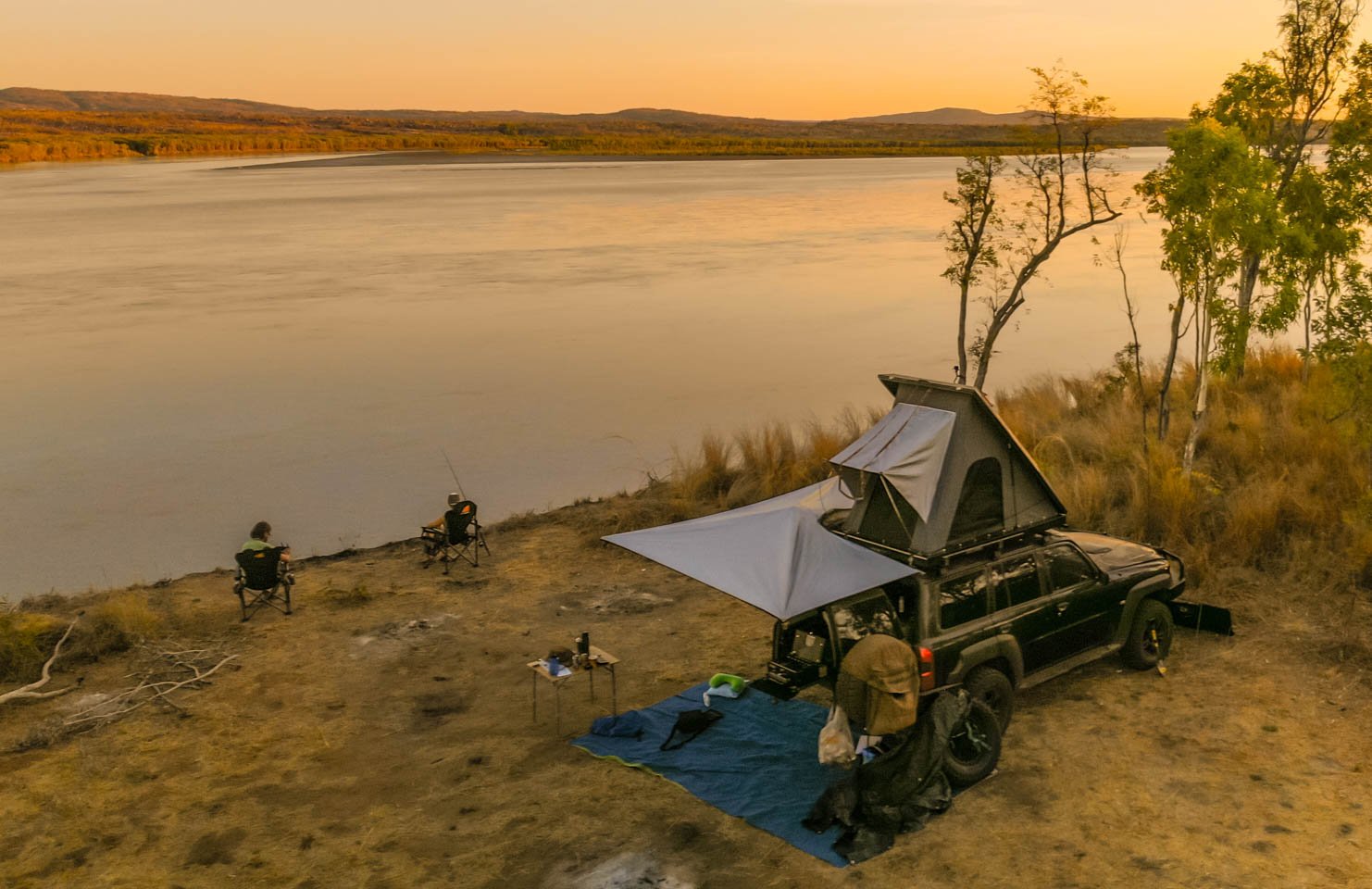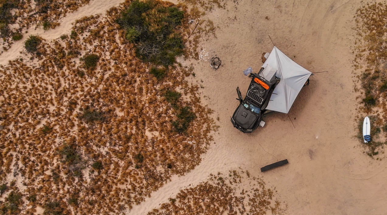 The most important mod of the car: We sleep in a AluCab Expedition 3 roof top tent. It goes perfectly well with the AluCab 270° shadow awn on its side to shelter from sun and rain. We also carry AluCab sidewalls for that extra bit of privacy or protection during longer camping stays. Oztent King Kokoda chairs and a Bo-Camp bamboo camping table make the campsite feel like a comfortable lounge. On sand and dirt we spread the C-Gear RV mat if we feel like it.